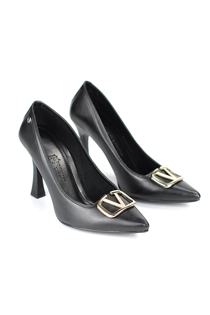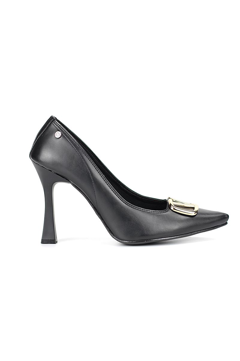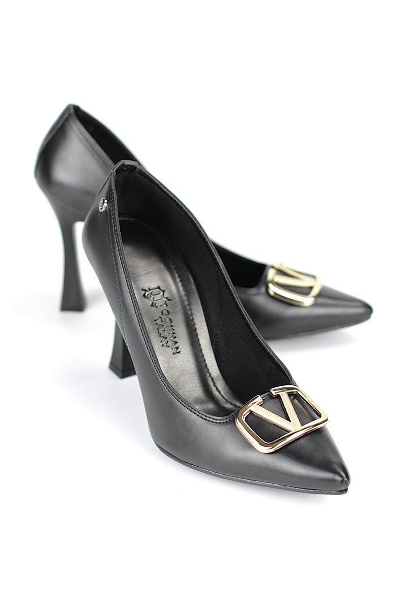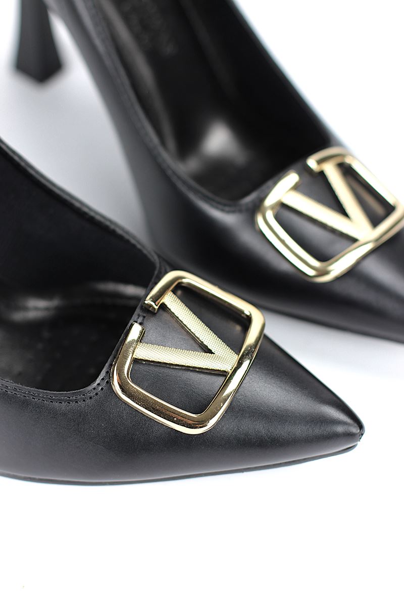 Camille Esnek Yumuşak Kaymaz Taban (10 cm) Siyah Cilt V Toka Kadın Topuklu Ayakkabı