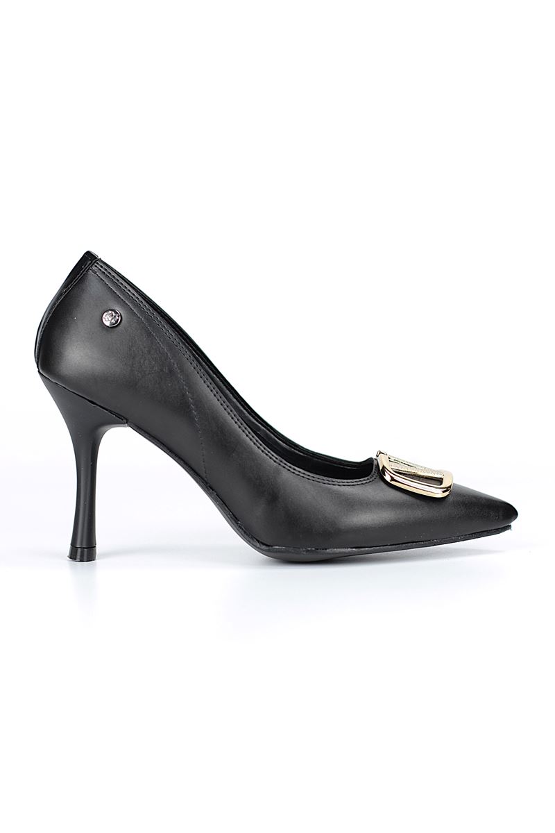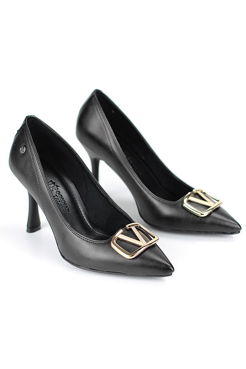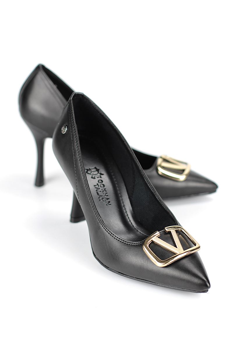 Hana Esnek Yumuşak Kaymaz Taban (8 cm) Siyah Cilt V Toka Kadın Topuklu Ayakkabı