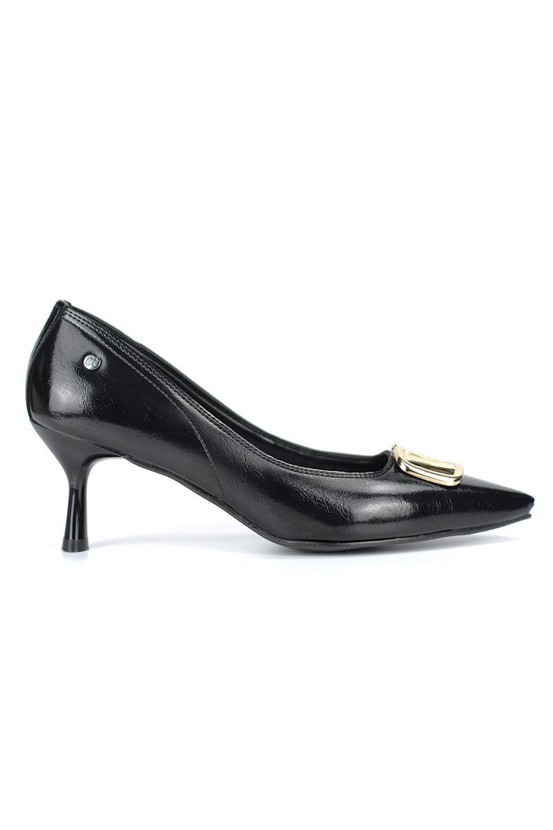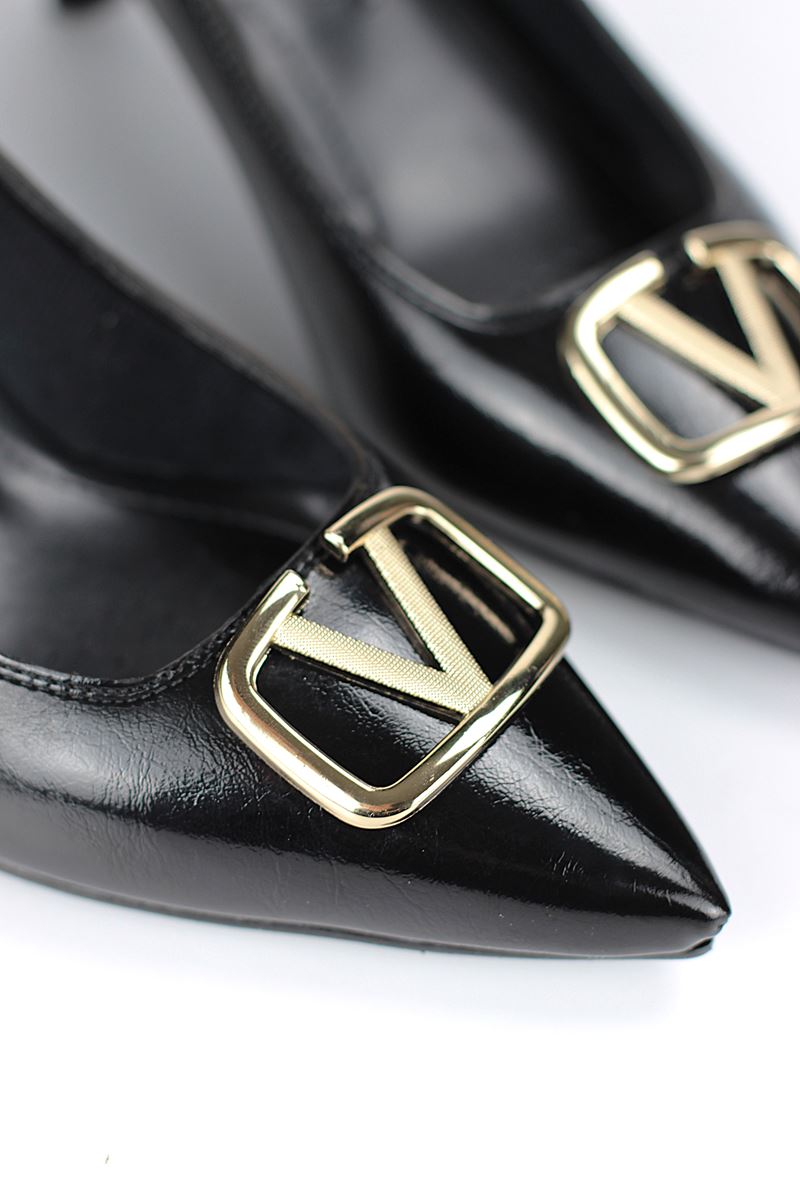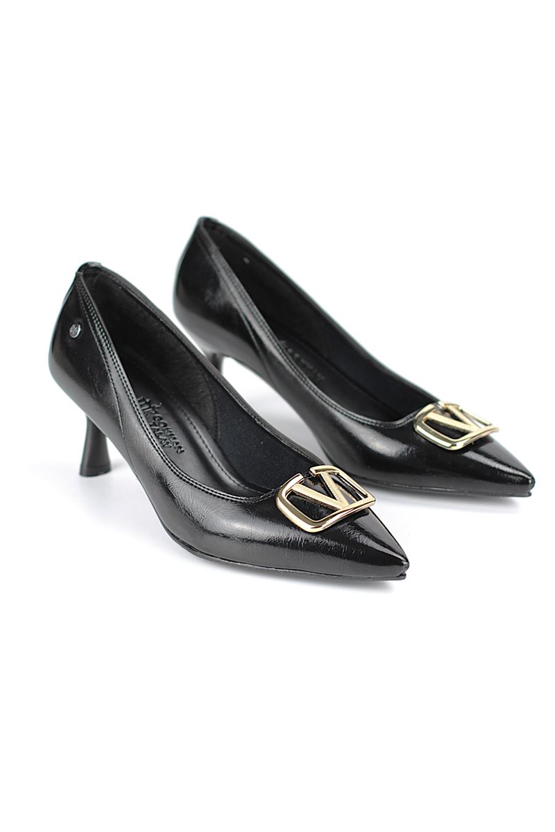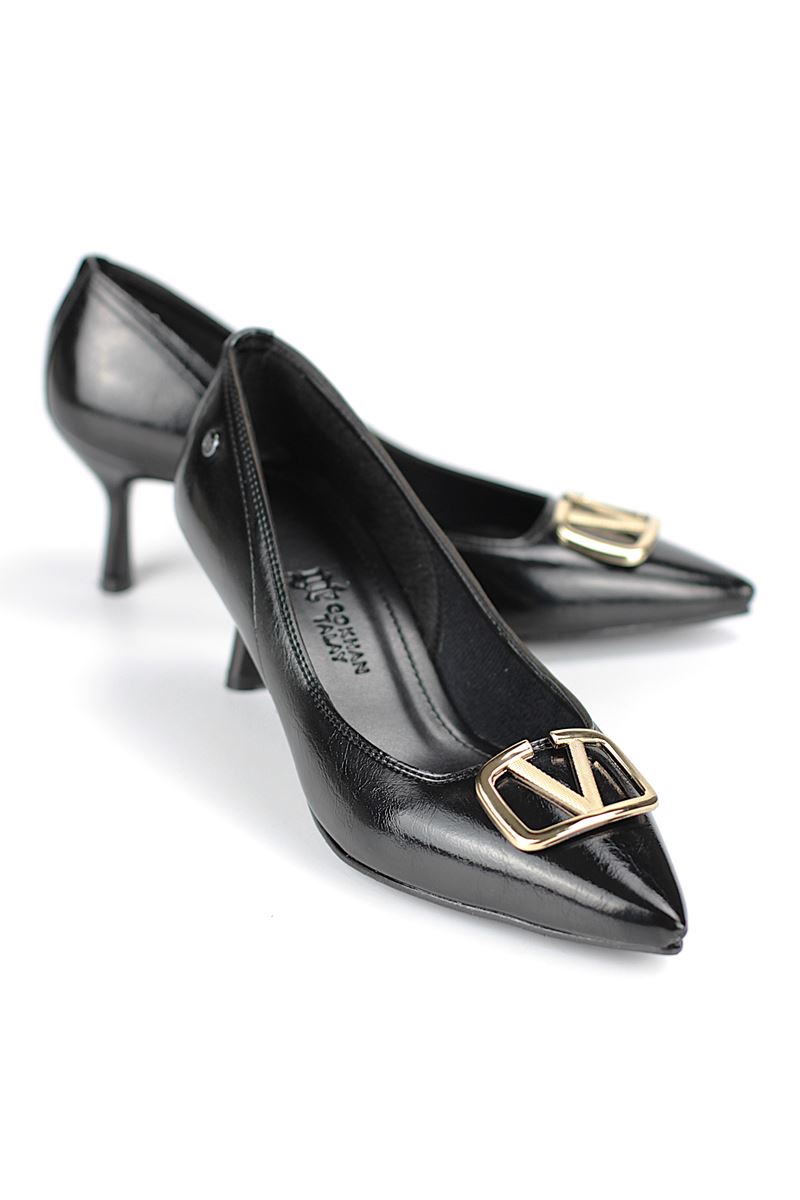 Luxe Esnek Yumuşak Kaymaz Taban (4 cm) Siyah Rugan V Toka Kadın Topuklu Ayakkabı