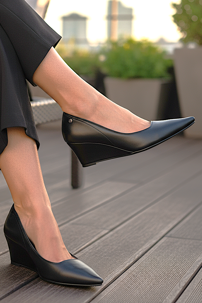 Pia Esnek Yumuşak Kaymaz Taban (4 cm) Kadın Dolgu Topuk Siyah Cilt Ayakkabı