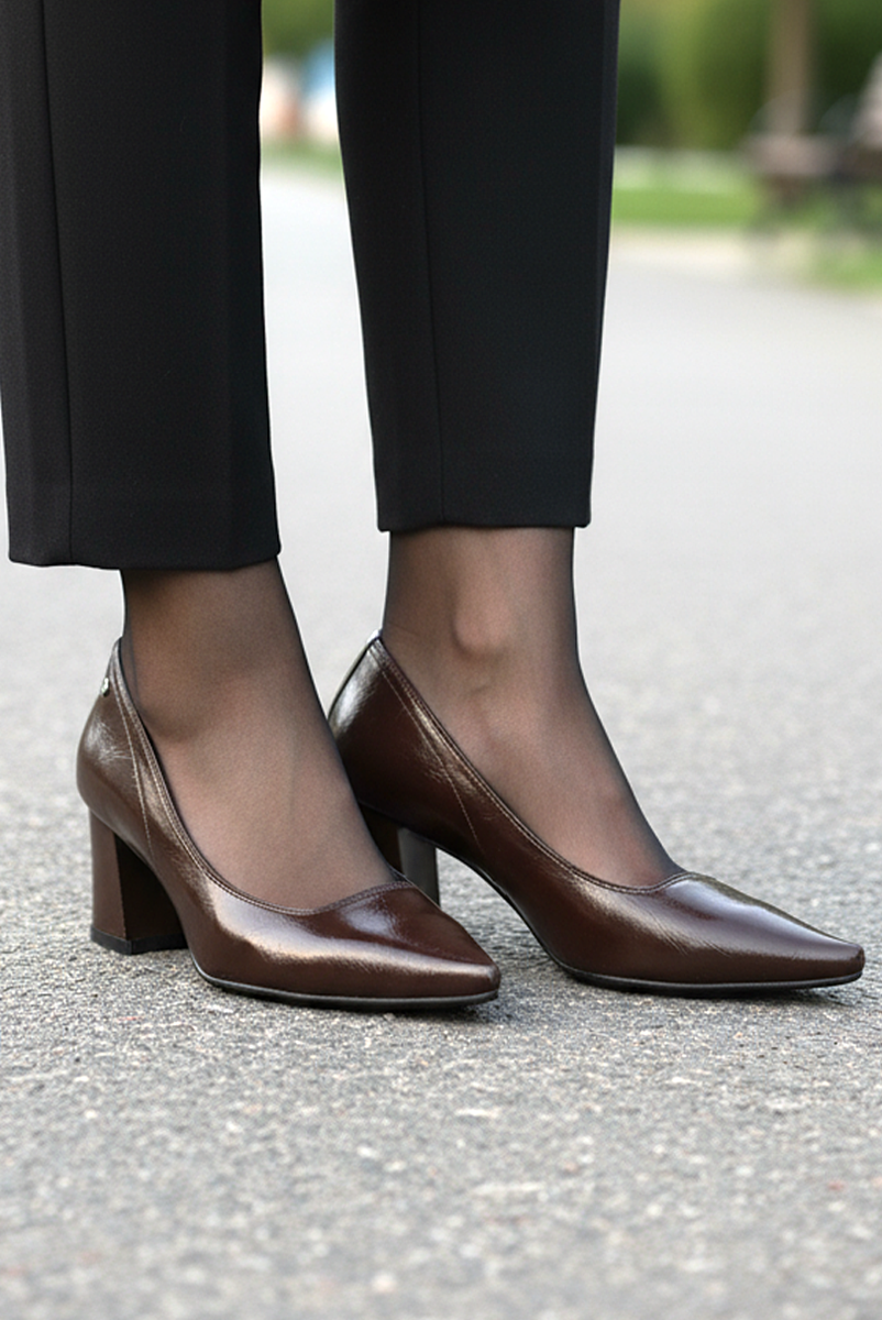 Zaneta Esnek Yumuşak Kaymaz Taban (4 cm) Kadın Kalın Topuk Kahverengi Rugan Ayakkabı