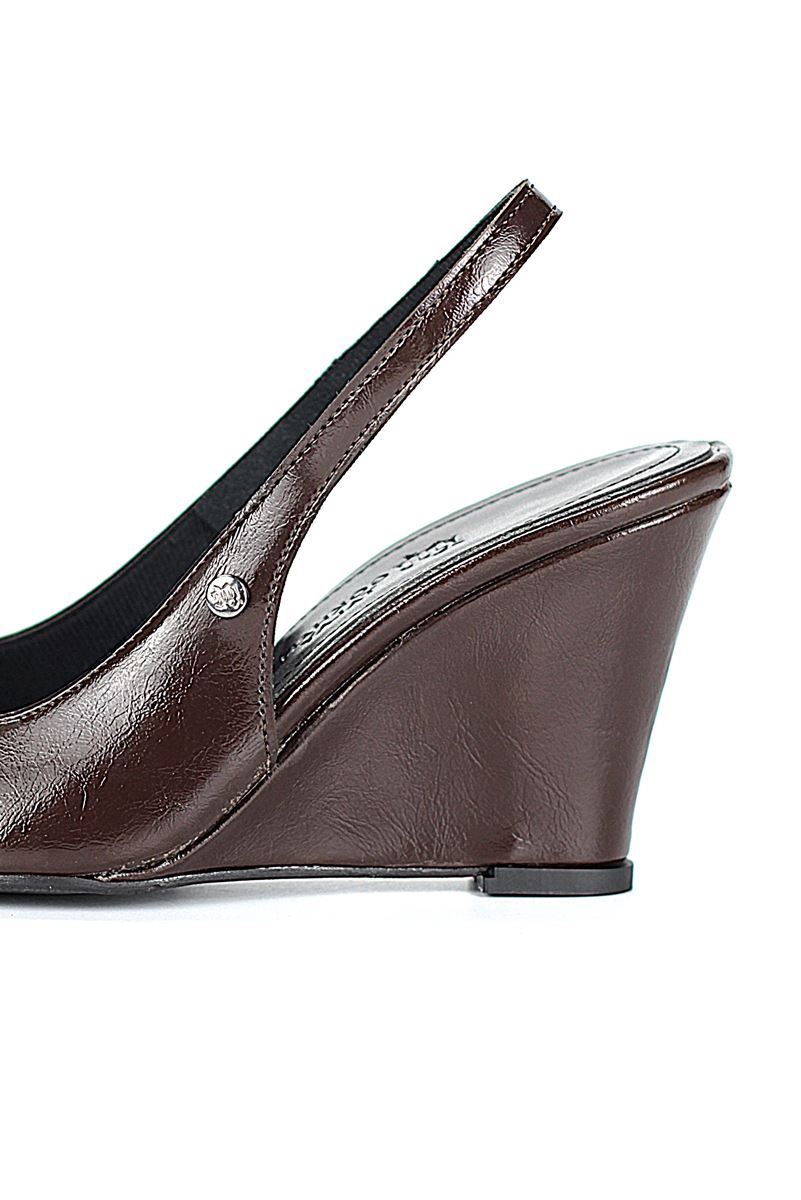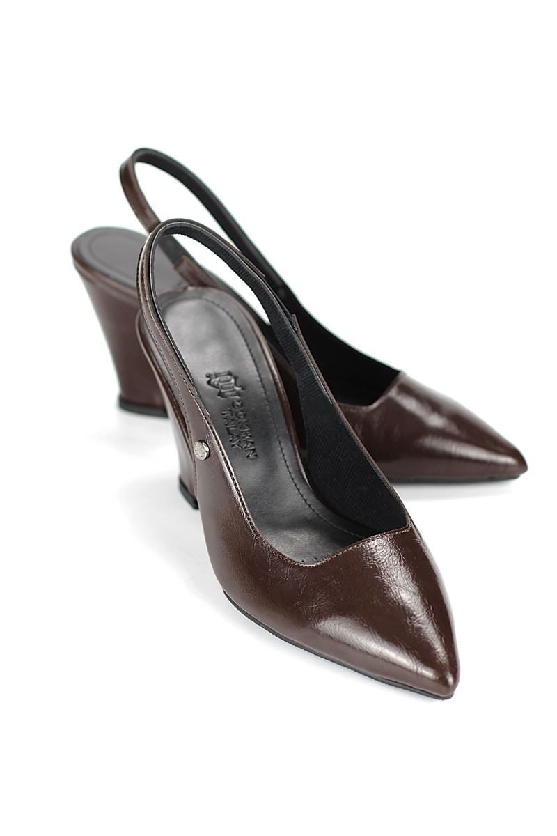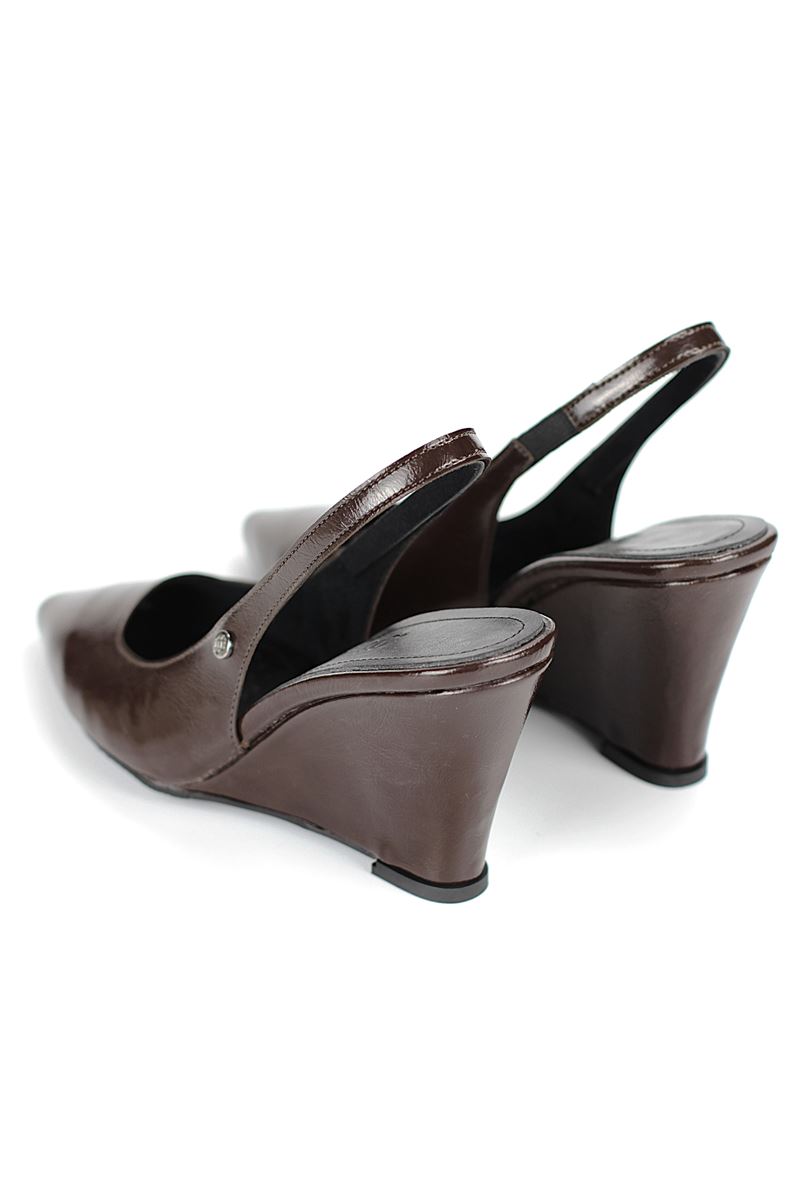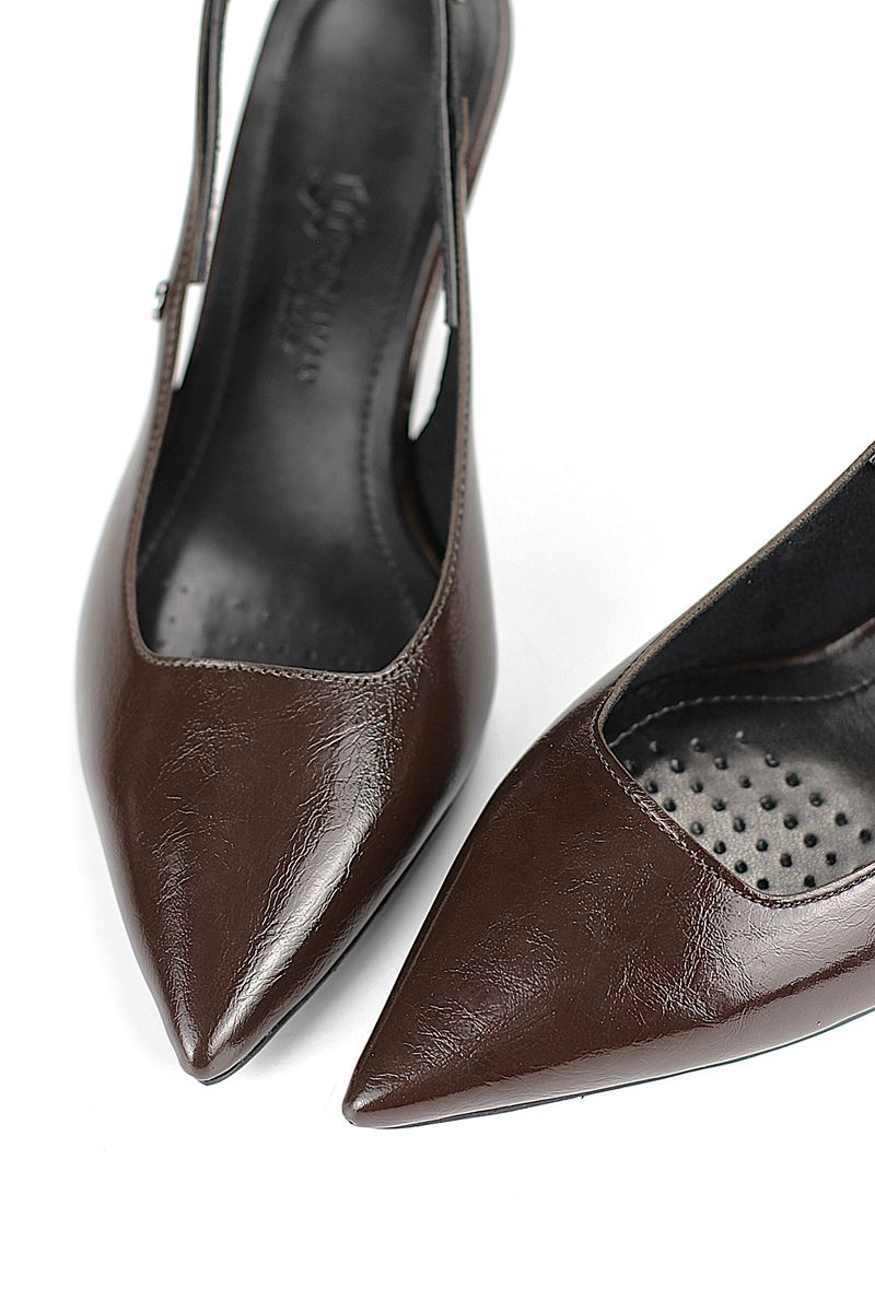 Modern ve şık tasarımıyla öne çıkan Kahverengi Rugan slingback topuklu ayakkabı, rugan dokusu ve Dolgu topuğuyla özel günlerde ve ofis kombinlerinde şıklığınızı tamamlar. Kaymaz tabanı Esnek Dokusu ve rahat kalıbıyla hem stil sahibi hem de konforludur.