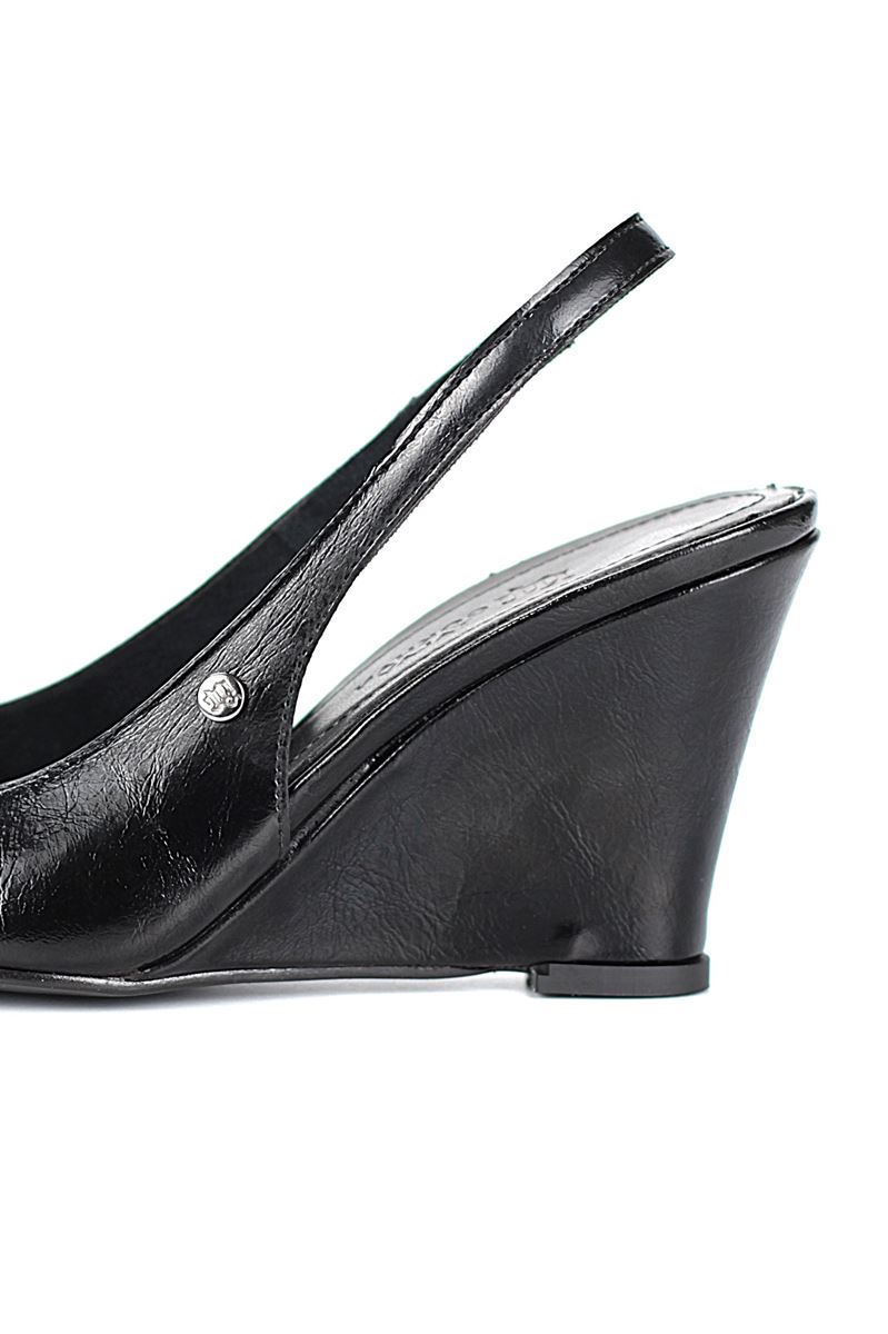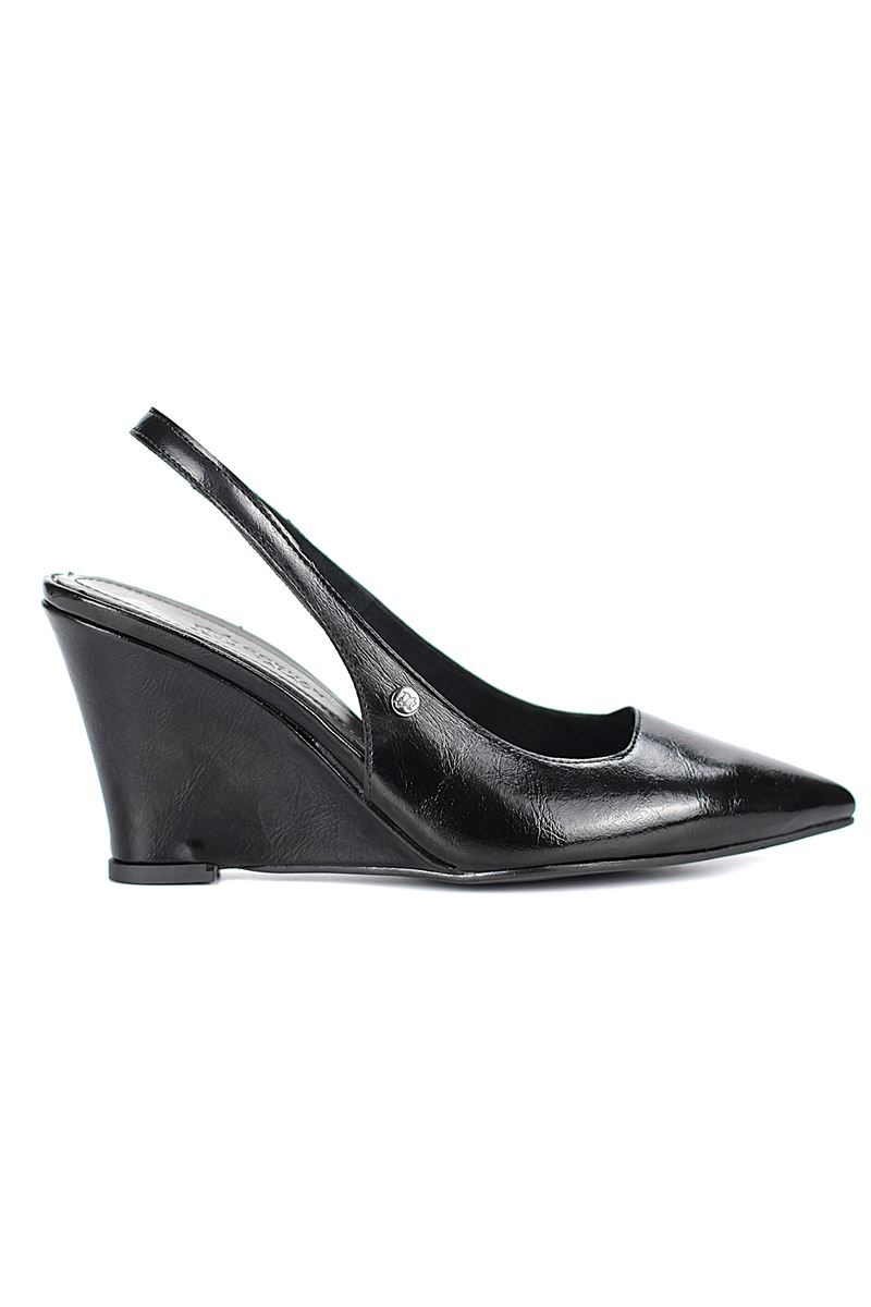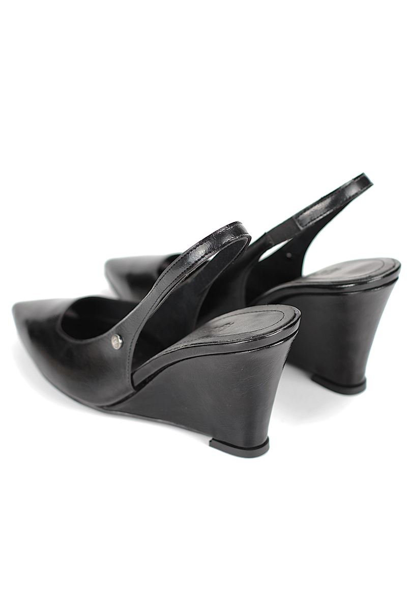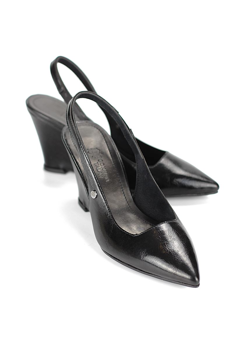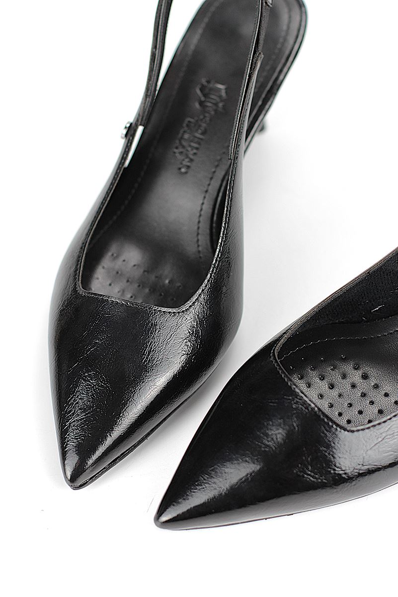 Modern ve şık tasarımıyla öne çıkan Siyah Rugan slingback topuklu ayakkabı, rugan dokusu ve Dolgu topuğuyla özel günlerde ve ofis kombinlerinde şıklığınızı tamamlar. Kaymaz tabanı Esnek Dokusu ve rahat kalıbıyla hem stil sahibi hem de konforludur.