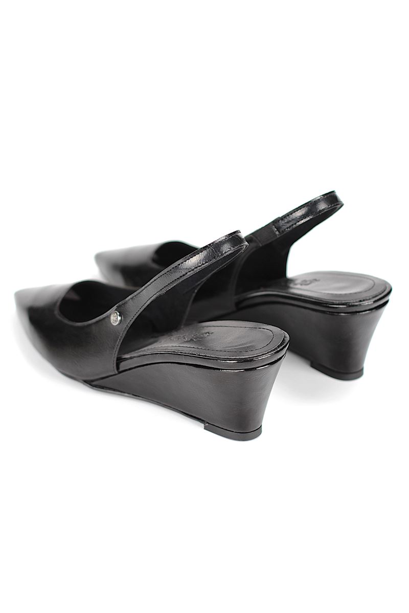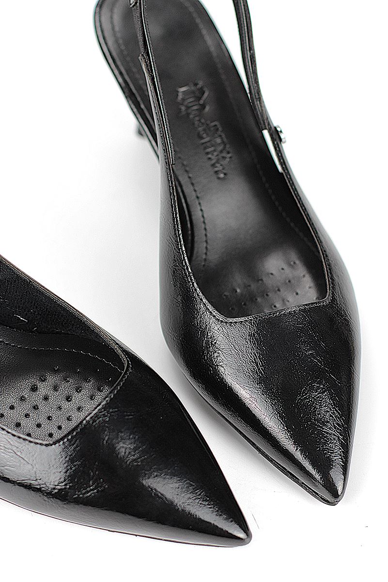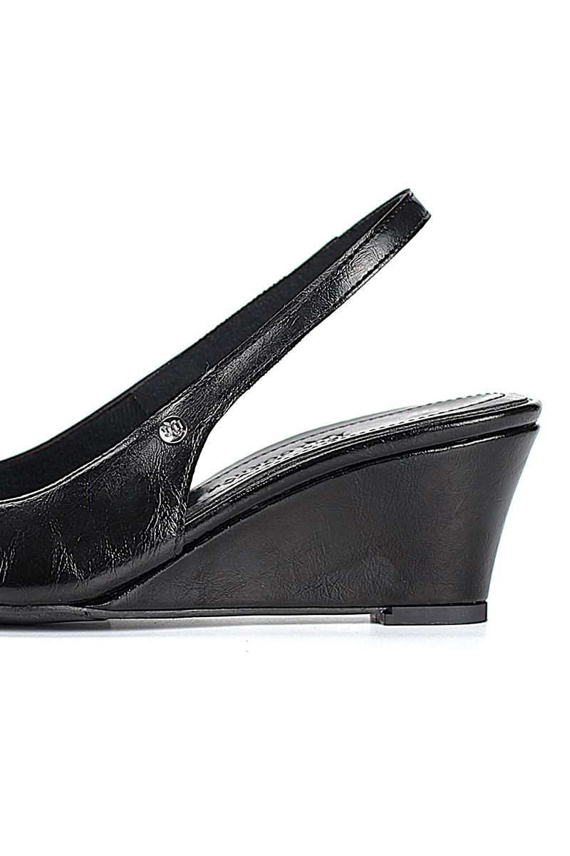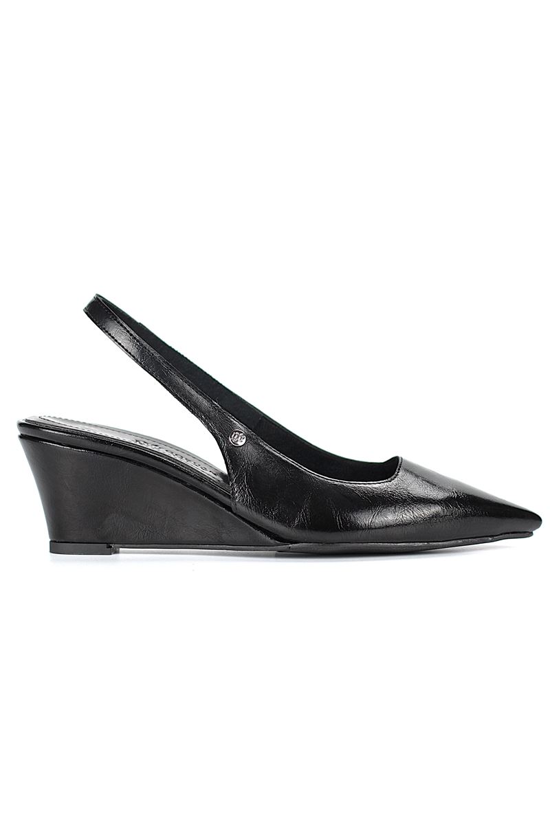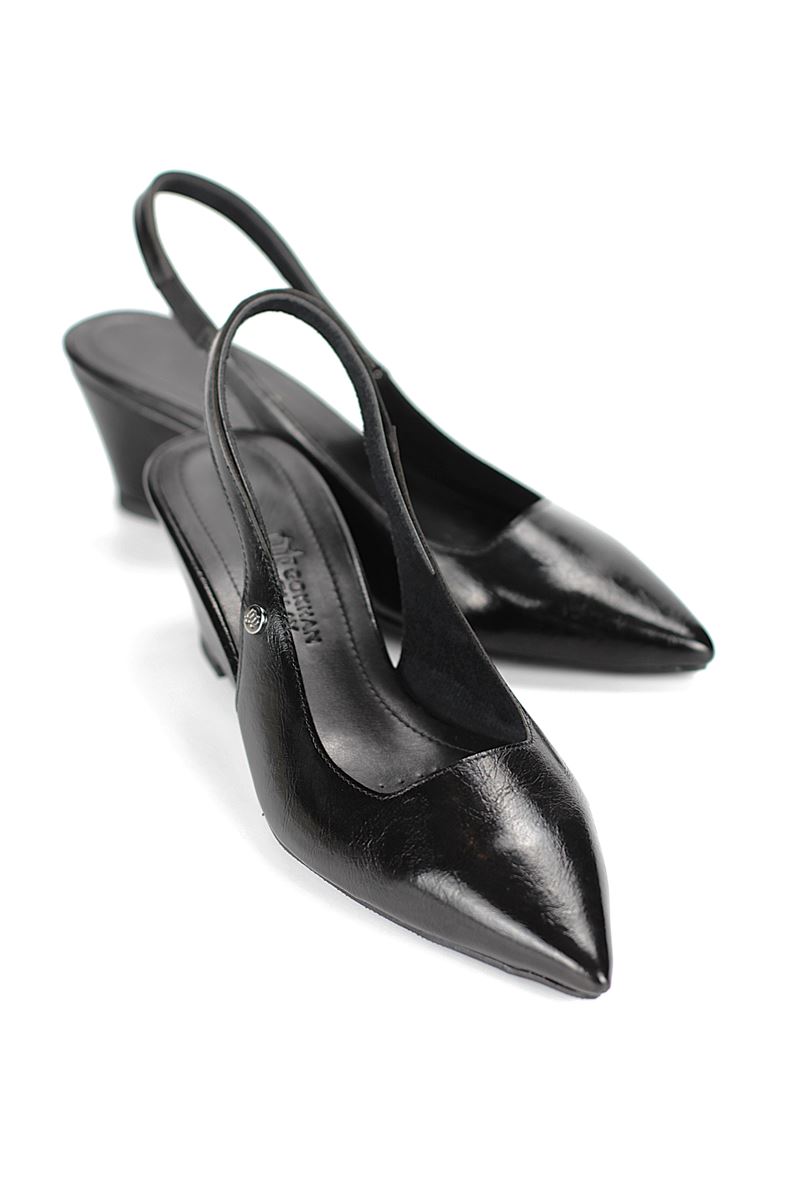 Modern ve şık tasarımıyla öne çıkan Siyah Rugan slingback topuklu ayakkabı, rugan dokusu ve Dolgu topuğuyla özel günlerde ve ofis kombinlerinde şıklığınızı tamamlar. Kaymaz tabanı Esnek Dokusu ve rahat kalıbıyla hem stil sahibi hem de konforludur.