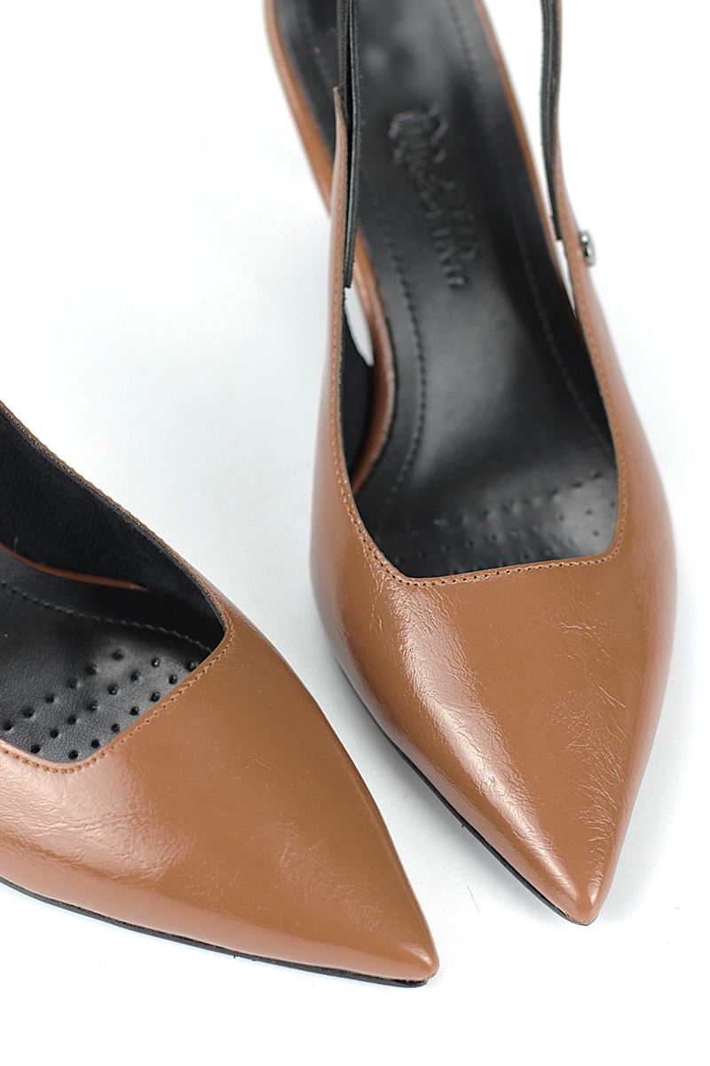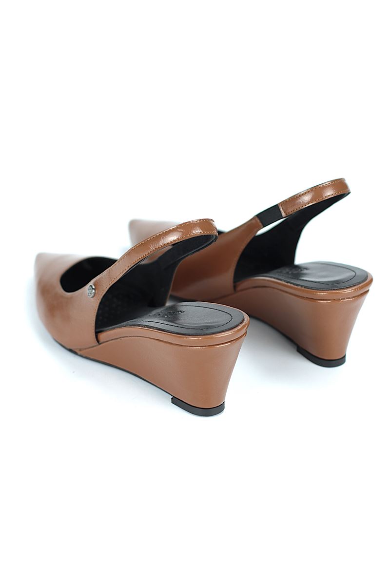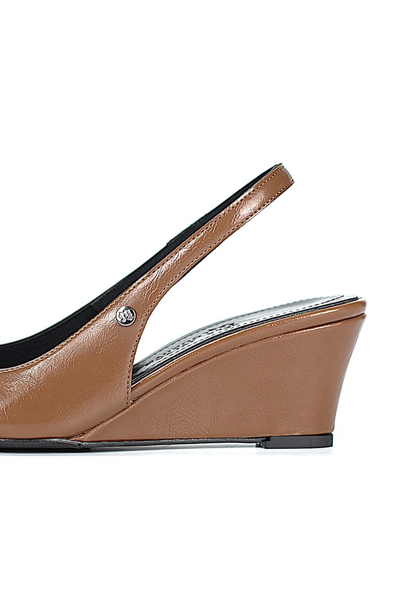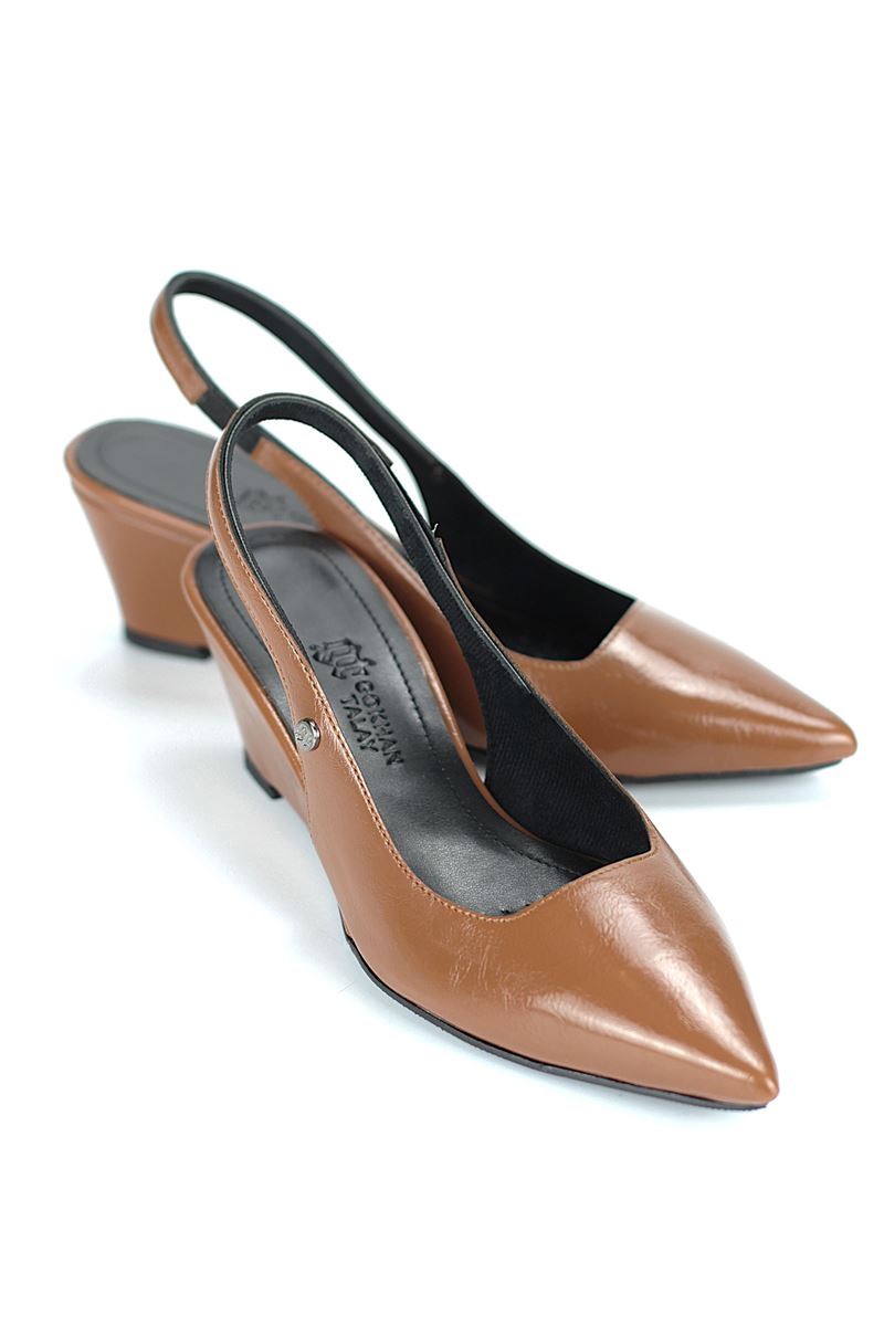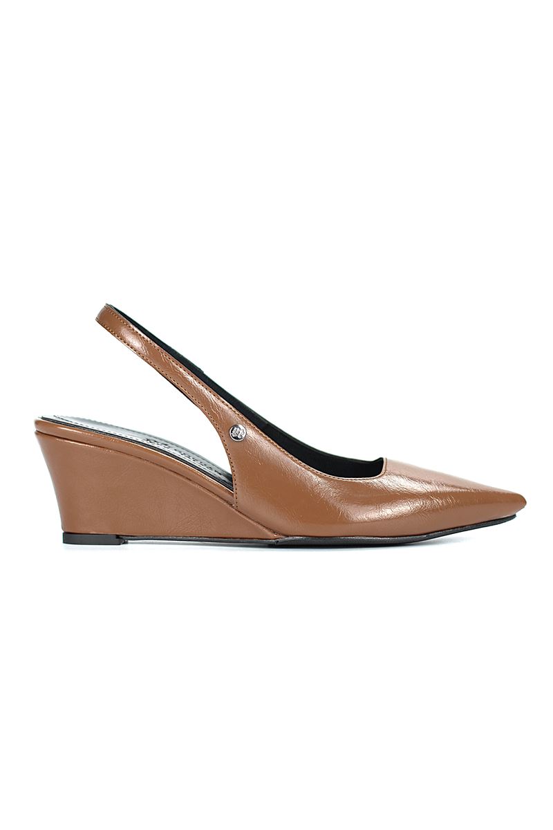 Modern ve şık tasarımıyla öne çıkan Taba Rugan slingback topuklu ayakkabı, rugan dokusu ve Dolgu topuğuyla özel günlerde ve ofis kombinlerinde şıklığınızı tamamlar. Kaymaz tabanı Esnek Dokusu ve rahat kalıbıyla hem stil sahibi hem de konforludur.