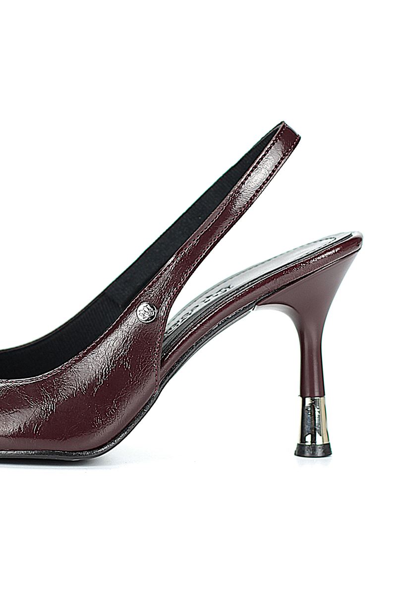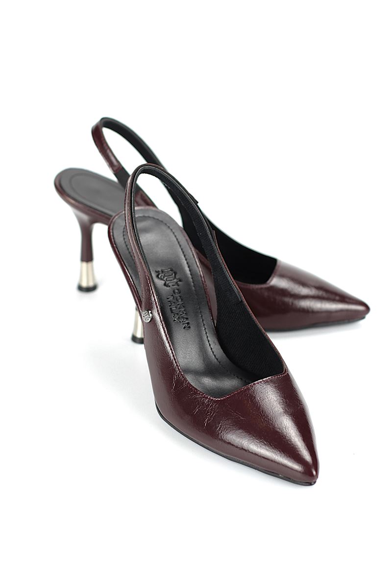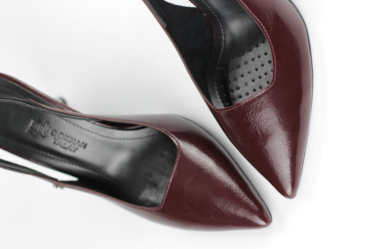 Modern ve şık tasarımıyla öne çıkan bordo slingback topuklu ayakkabı, rugan dokusu ve zarif ince topuğuyla özel günlerde ve ofis kombinlerinde şıklığınızı tamamlar. Kaymaz tabanı Esnek Dokusu ve rahat kalıbıyla hem stil sahibi hem de konforludur.