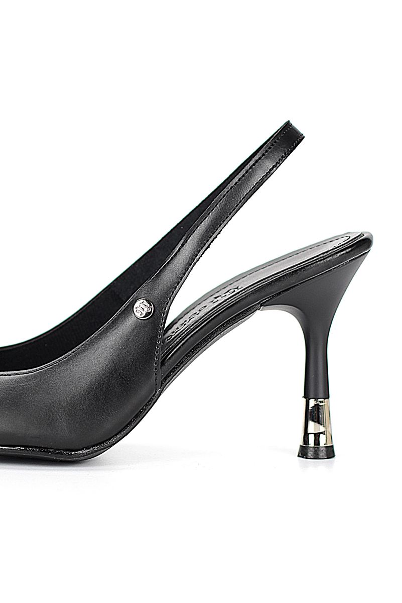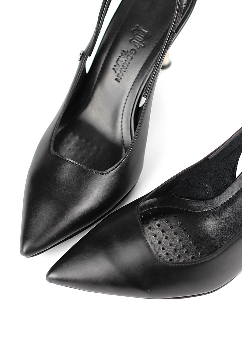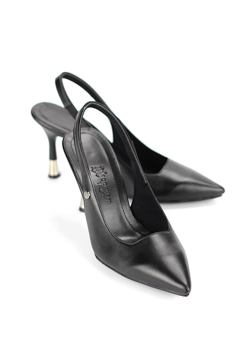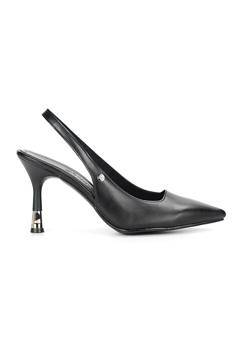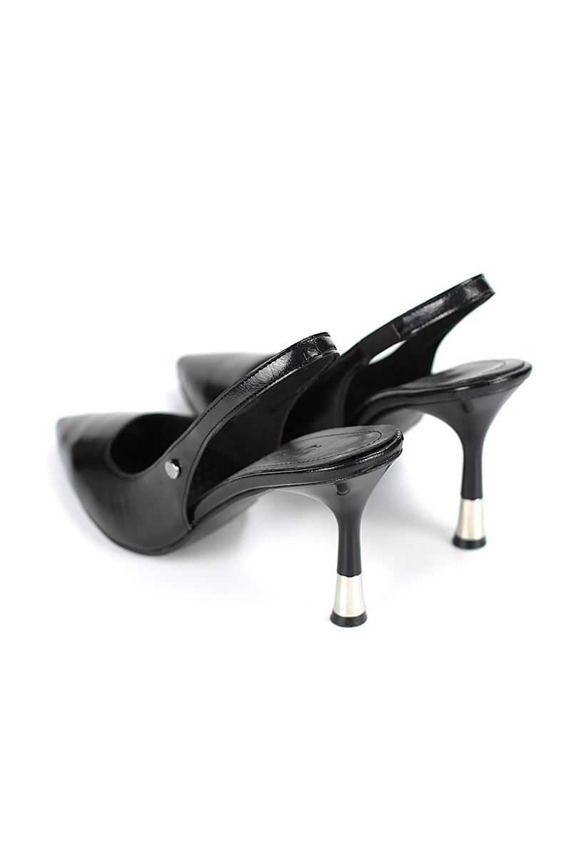 Modern ve şık tasarımıyla öne çıkan Siyah Cilt slingback topuklu ayakkabı, rugan dokusu ve zarif ince topuğuyla özel günlerde ve ofis kombinlerinde şıklığınızı tamamlar. Kaymaz tabanı Esnek Dokusu ve rahat kalıbıyla hem stil sahibi hem de konforludur.