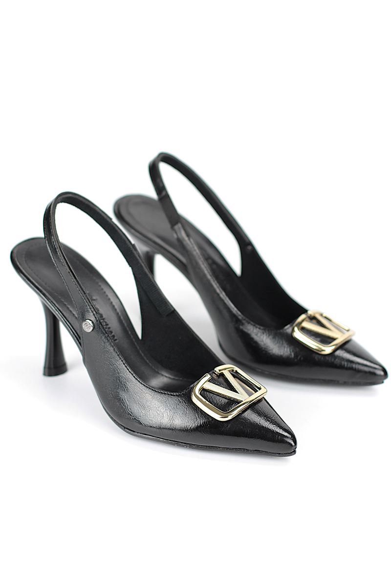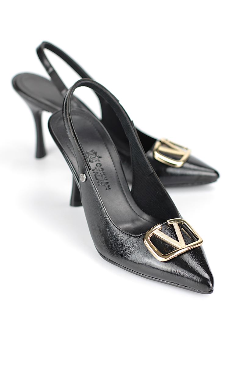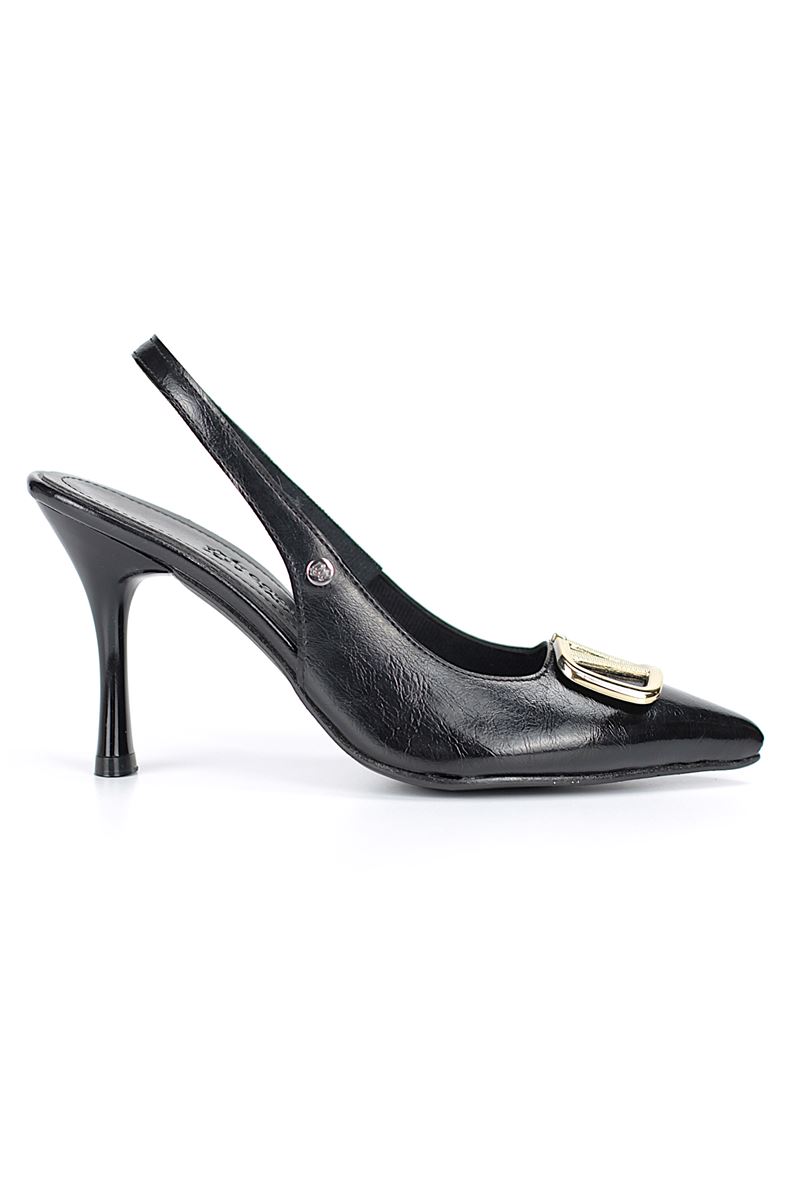 Modern ve şık tasarımıyla öne çıkan Siyah Rugan slingback topuklu ayakkabı, zarif ince topuğuyla özel günlerde ve ofis kombinlerinde şıklığınızı tamamlar. Kaymaz tabanı Esnek Dokusu ve rahat kalıbıyla hem stil sahibi hem de konforludur.