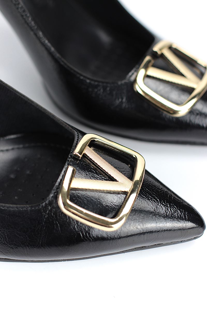 Hilda Esnek Yumuşak Kaymaz Taban (8 cm) Siyah Rugan Açık Lastikli V Toka Kadın Topuklu Ayakkabı