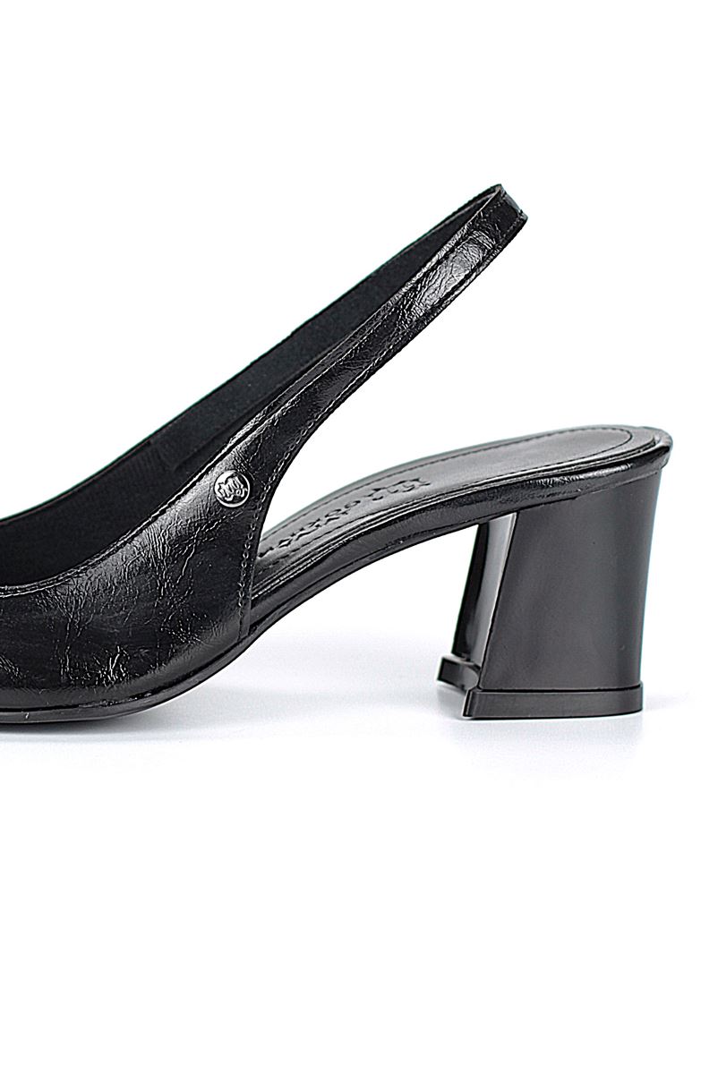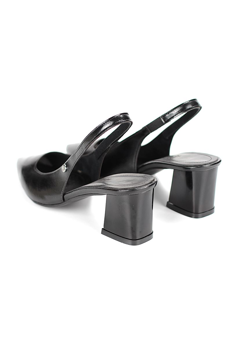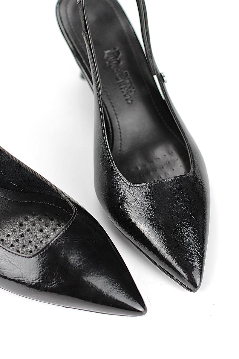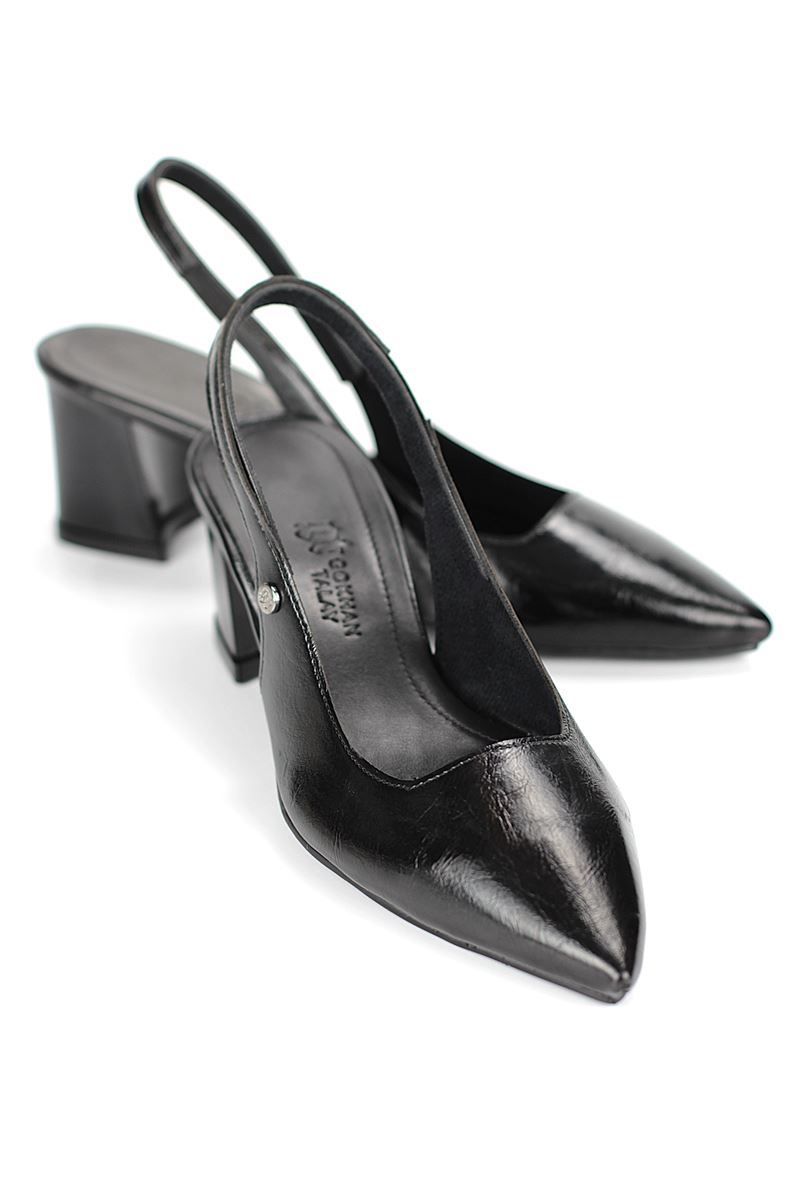 Modern ve şık tasarımıyla öne çıkan Siyah Rugan slingback topuklu ayakkabı, rugan dokusu ve zarif i topuğuyla özel günlerde ve ofis kombinlerinde şıklığınızı tamamlar. Kaymaz tabanı Esnek Dokusu ve rahat kalıbıyla hem stil sahibi hem de konforludur.