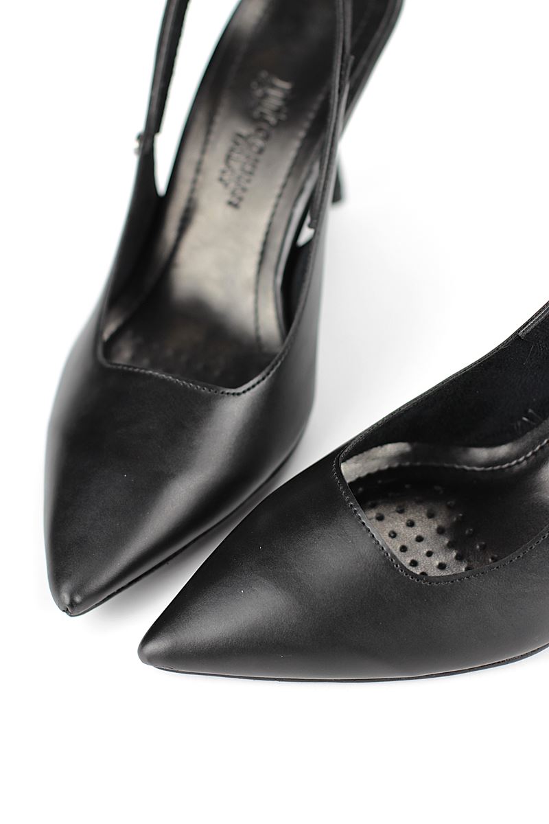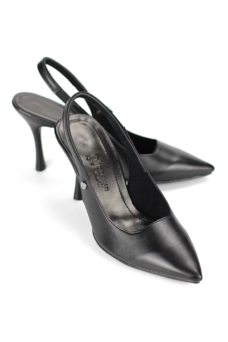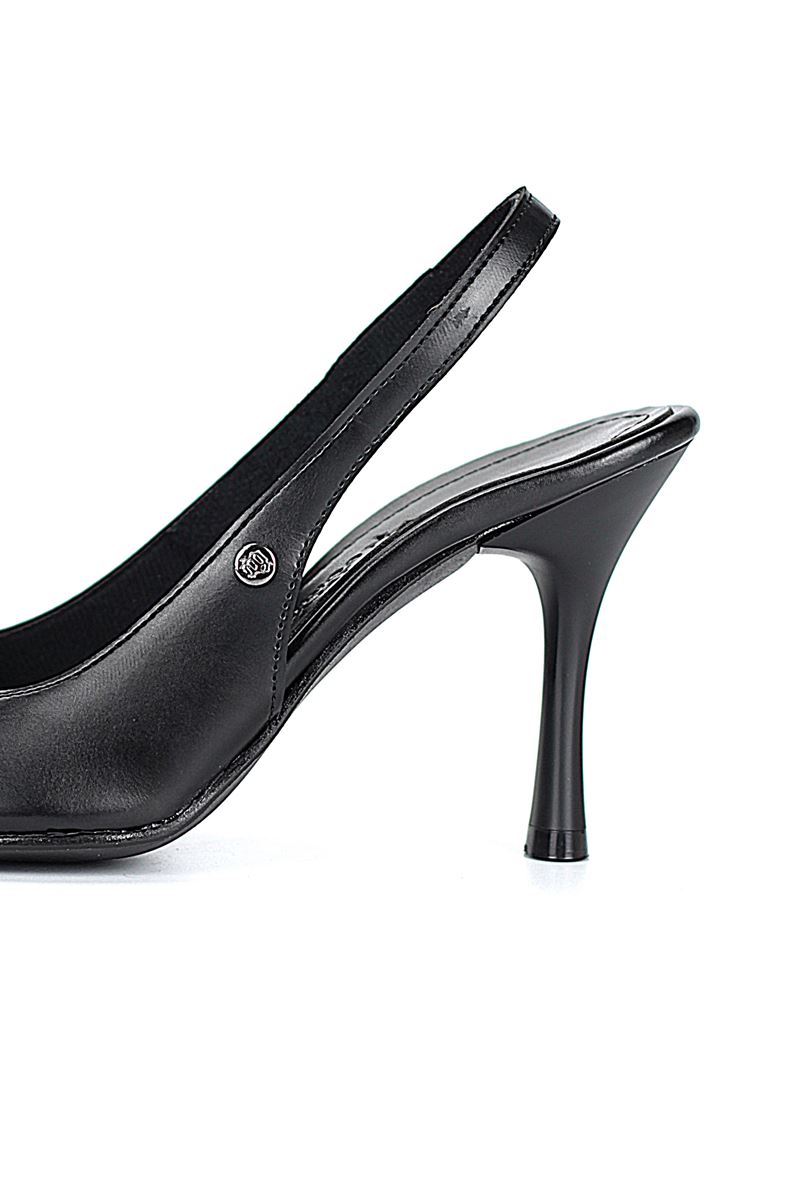 Modern ve şık tasarımıyla öne çıkan Siyah Cilt slingback topuklu ayakkabı, rugan dokusu ve zarif ince topuğuyla özel günlerde ve ofis kombinlerinde şıklığınızı tamamlar. Kaymaz tabanı Esnek Dokusu ve rahat kalıbıyla hem stil sahibi hem de konforludur.