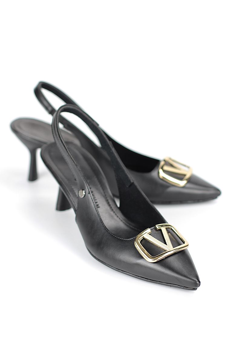 Liselotte Esnek Yumuşak Kaymaz Taban (4 cm) Siyah Cilt Açık Lastikli V Toka Kadın Topuklu Ayakkabı