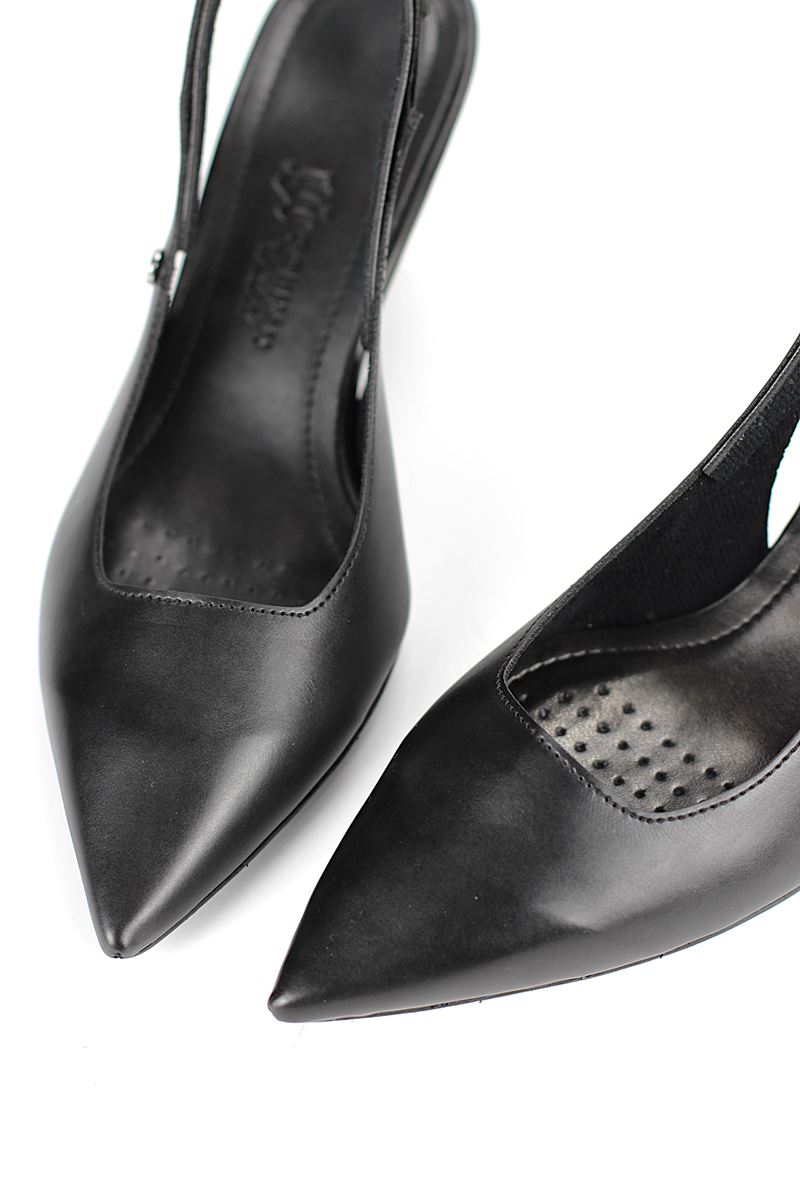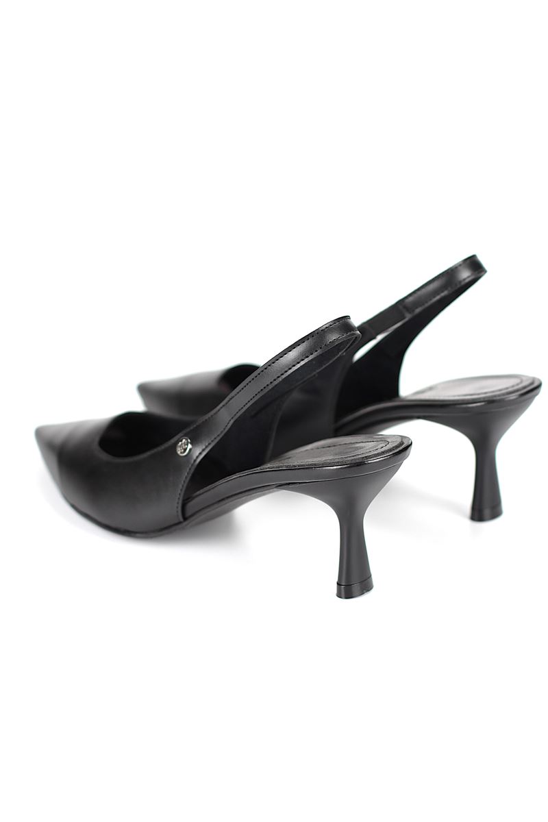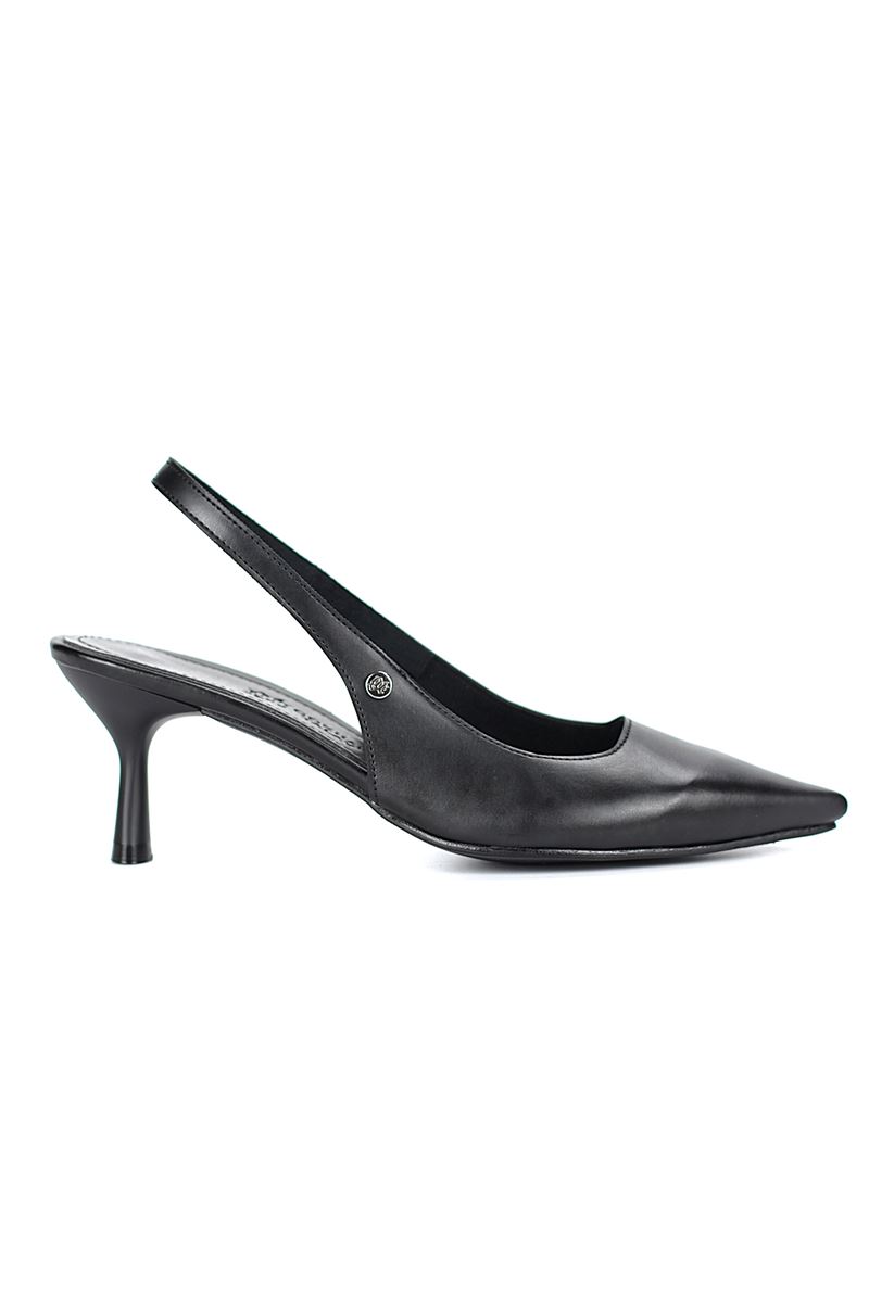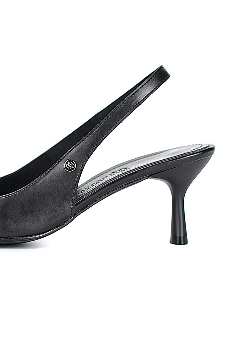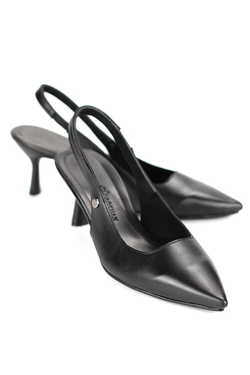 Modern ve şık tasarımıyla öne çıkan Siyah Cilt slingback topuklu ayakkabı, rugan dokusu ve zarif ince topuğuyla özel günlerde ve ofis kombinlerinde şıklığınızı tamamlar. Kaymaz tabanı Esnek Dokusu ve rahat kalıbıyla hem stil sahibi hem de konforludur.