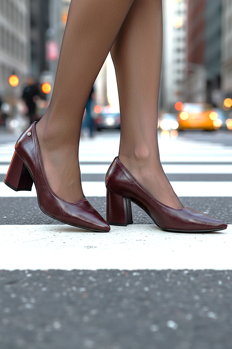 Nevra Esnek Yumuşak Kaymaz Taban (7 cm) Bordo Rugan Kadın Kalın Topuklu Ayakkabı