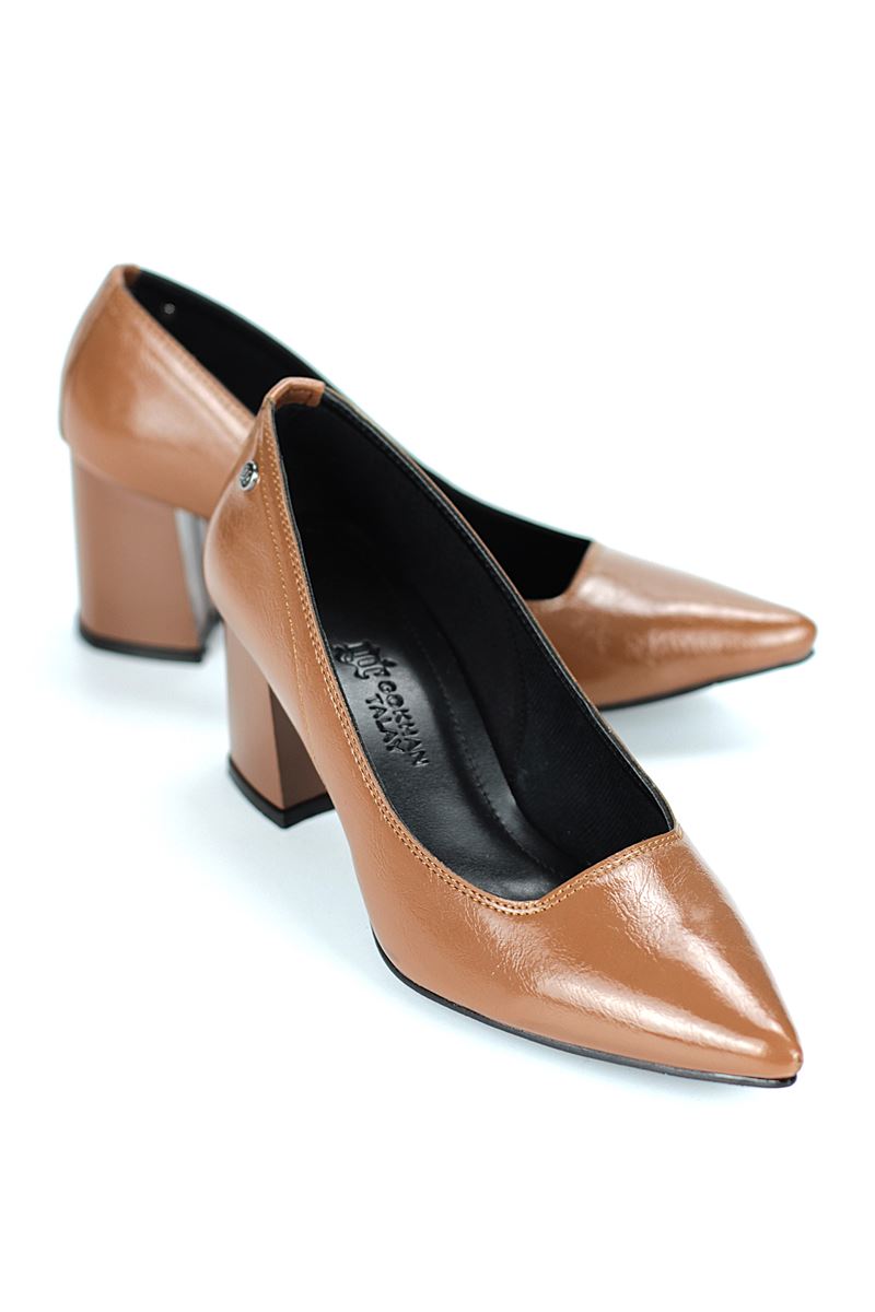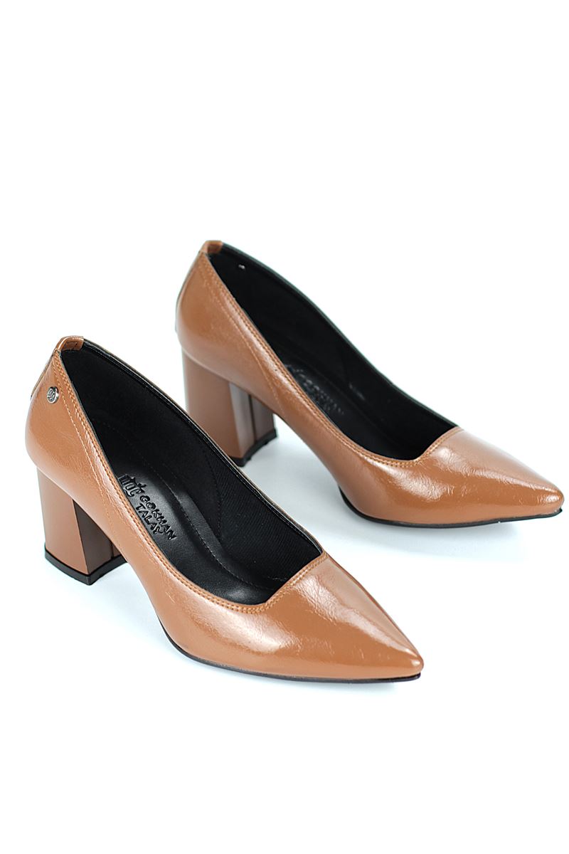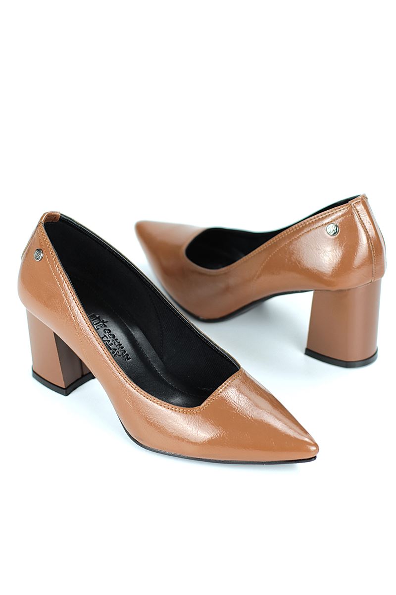 Nevra Esnek Yumuşak Kaymaz Taban (7 cm) Taba Rugan Kadın Kalın Topuklu Ayakkabı