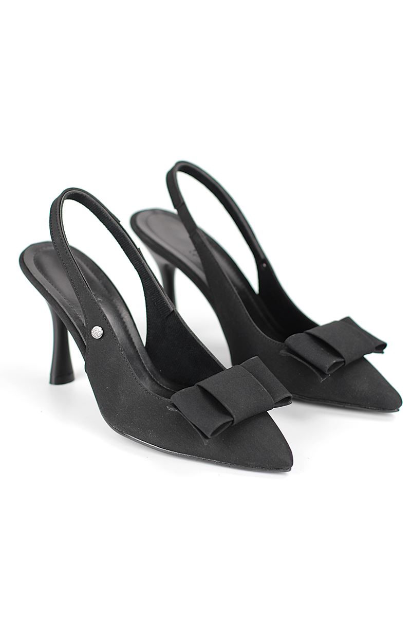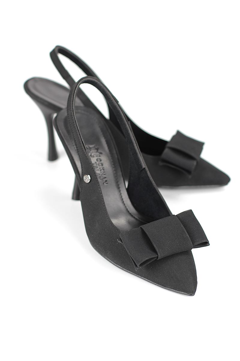 Nivelle Esnek Yumuşak Kaymaz Taban (8 cm) Siyah Süet Açık Lastikli Köşe Fiyonk Kadın Topuklu Ayakkabı