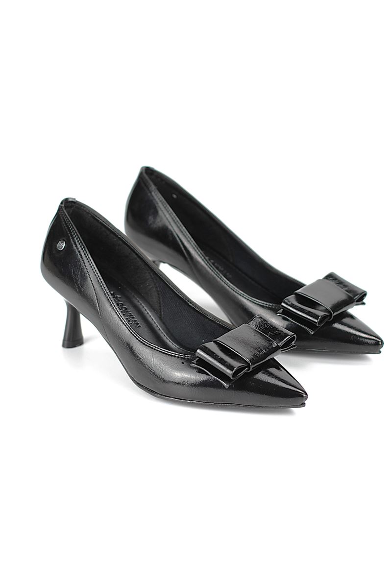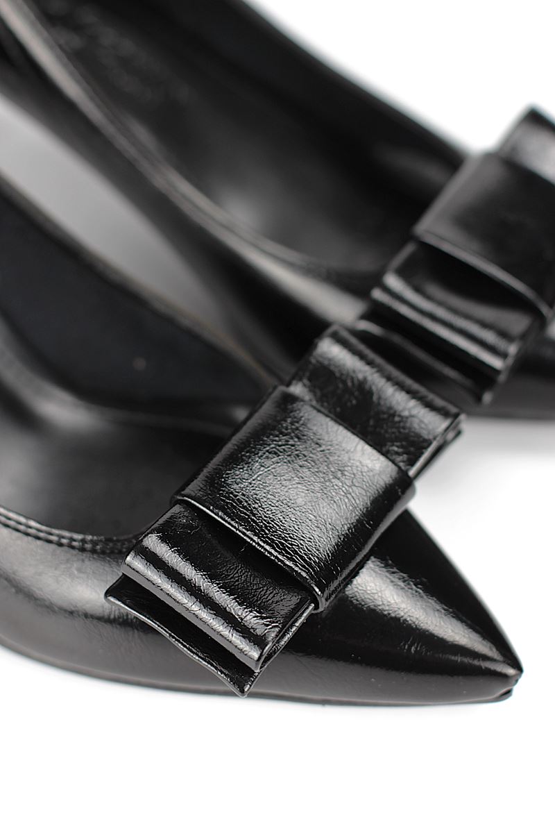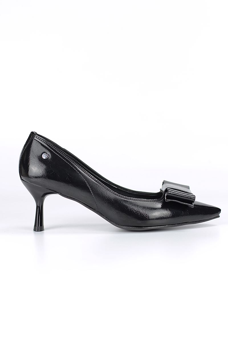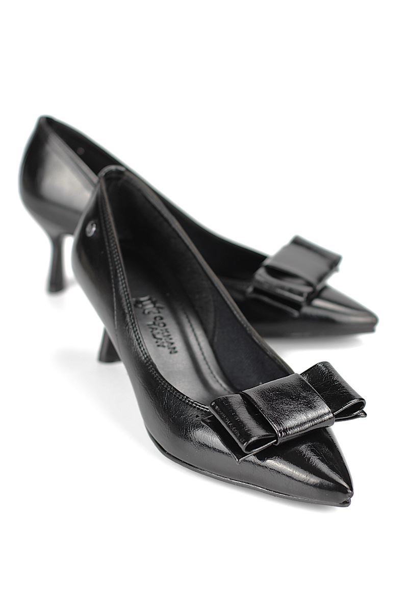 Vellon Esnek Yumuşak Kaymaz Taban (4 cm) Siyah Rugan Köşe Fiyonk Kadın Topuklu Ayakkabı
