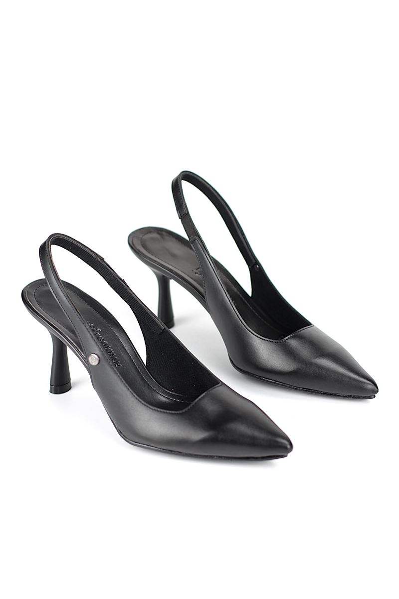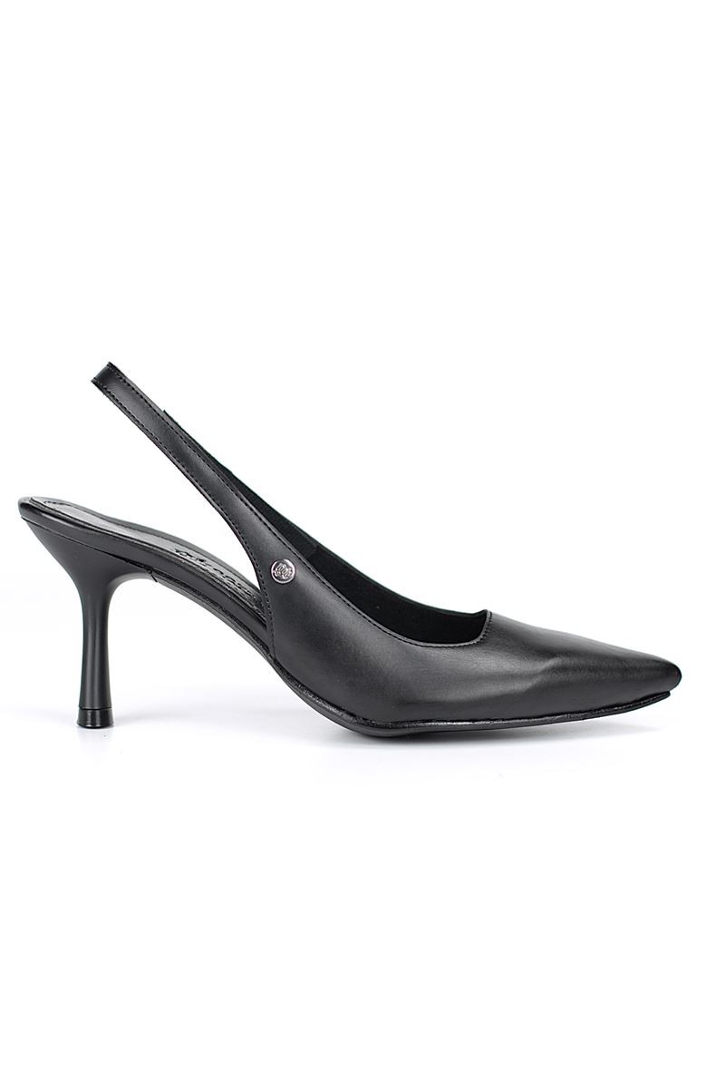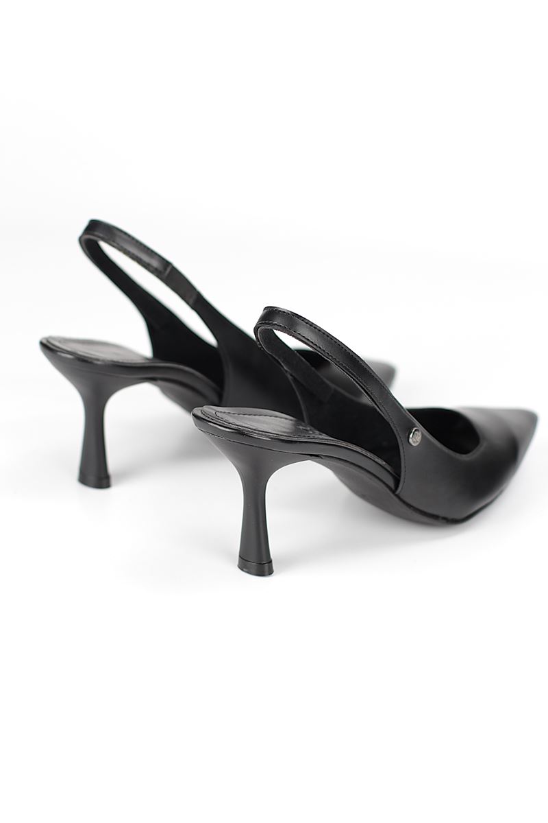 Modern ve şık tasarımıyla öne çıkan Siyah Cilt slingback topuklu ayakkabı, rugan dokusu ve zarif ince topuğuyla özel günlerde ve ofis kombinlerinde şıklığınızı tamamlar. Kaymaz tabanı Esnek Dokusu ve rahat kalıbıyla hem stil sahibi hem de konforludur.